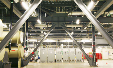 This data center includes 13,500 square feet of critical environment housed in a steel-framed, tilt-up panel building. The facility provides 3.05MW of critical power for its operation, including a distributed redundant electrical topography. Power is provided with existing 12kV switchgear, new transformers and switchgear. Cooling solutions are provided by outside air and evaporative cooling, with supplemental direct expansion cooling and hot and cold aisle containment, with racks directly on slab without a raised floor. Standby power is provided with static UPS, batteries and three 2,500kVA generators.
